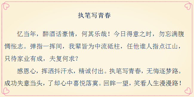 “現(xiàn)在,青春是用來奮斗的;將來,青春是用來回憶的?!碑?dāng)所有的經(jīng)歷化作記憶,那些年少時(shí)為理想揮灑的汗水,為成功付出的艱辛,終將成為彌足珍貴的人生財(cái)富。