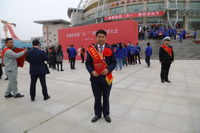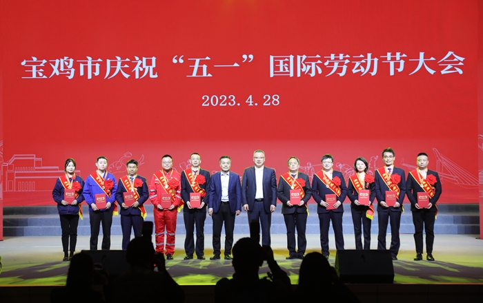 4月28日,在寶雞市慶?!拔逡弧眹H勞動(dòng)節(jié)大會(huì)上,集團(tuán)公司李紅軍同志被寶雞總工會(huì)授予五一勞動(dòng)獎(jiǎng)?wù)?,并上臺(tái)領(lǐng)獎(jiǎng)。(左三)