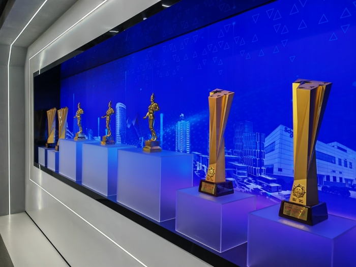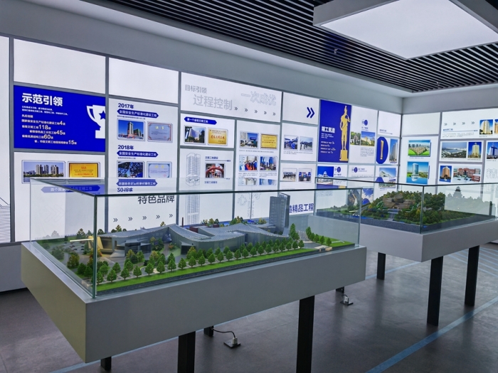 企業(yè)展覽館總面積516㎡,共分為四個(gè)展示單元,分別是:第一單元平地起高樓,主要展示集團(tuán)公司歷史沿革;第二單元風(fēng)雨筑輝煌,主要展示集團(tuán)公司壯闊征程;第三單元黨建強(qiáng)引領(lǐng),主要展示黨建、企業(yè)文化;第四單元公司榮譽(yù)展示;通過(guò)實(shí)物、展板、沙盤(pán)、模型、視屏、雕塑等表現(xiàn)手法,以圖、文、影、聲并茂的形式全方位呈現(xiàn)集團(tuán)公司走過(guò)的艱辛之路、創(chuàng)新之路、豪邁之路。